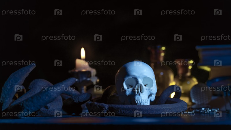 Волшебный череп на деревянном столе, горящая свеча в цепях и часы, остановившие время