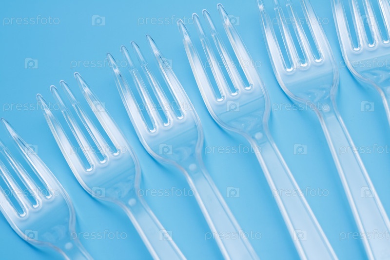 Пластиковая одноразовая посуда, столовые приборы. Быстрое питание. Чистые пластиковые вилки на синем фоне. Одноразовая посуда, загрязнение окружающей среды