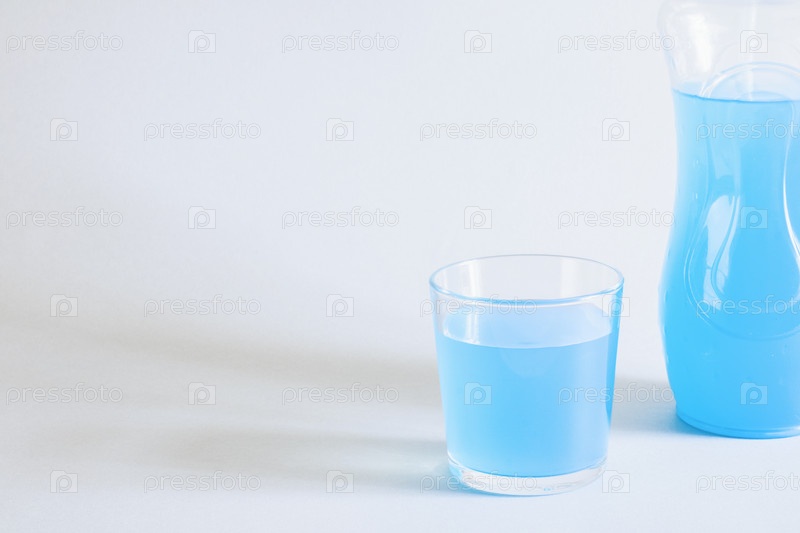 Изотонический напиток. Холодный синий детокс-коктейль в стеклянной чашке возле спортивной бутылки. Концепция напитков для спорта и фитнеса