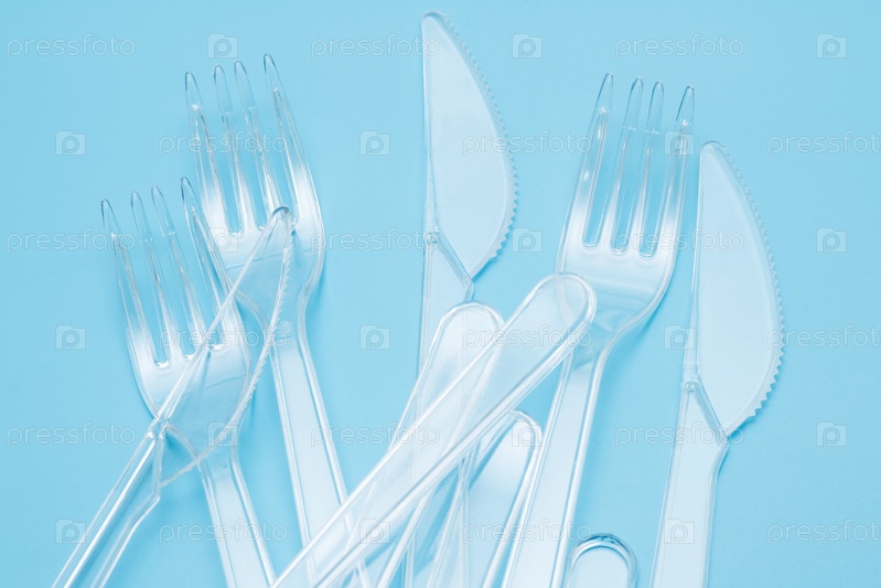 Пластиковая одноразовая посуда, столовые приборы. Быстрое питание. Чистые пластиковые вилки и ножи на синем фоне. Одноразовая посуда, загрязнение окружающей среды. Вид сверху, плоская планировка