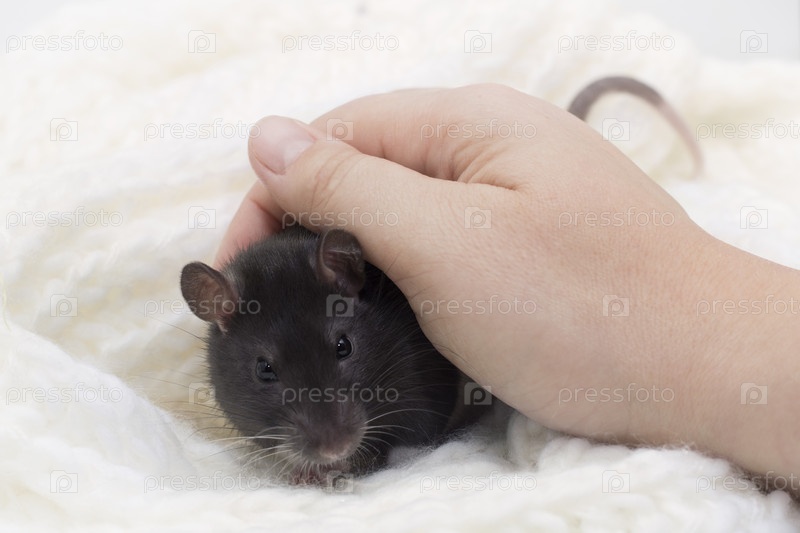 Маленькая пушистая крыса в белом кремовом вязаном шарфе. Женская рука гладит крысу. Символ китайского лунного гороскопа