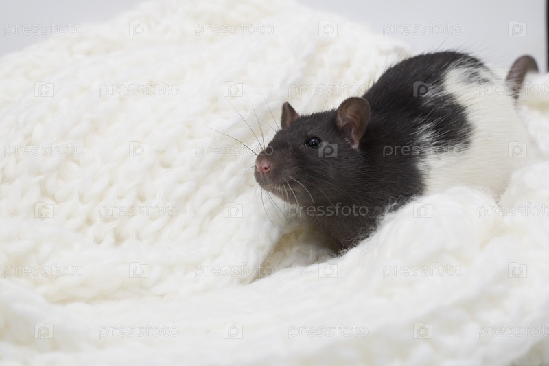 Рождественская крыса. Маленькая пушистая крыса в белом кремовом вязаном шарфе. Мышка новогодняя. Символ китайского лунного гороскопа