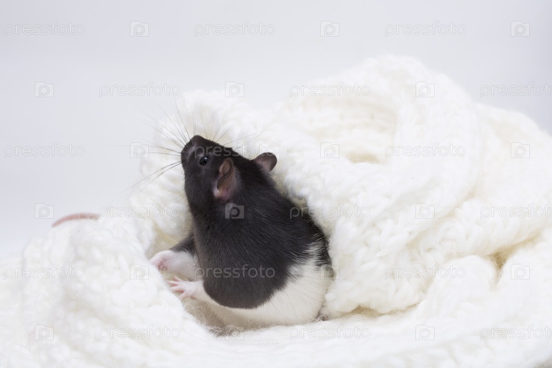 Рождественская крыса. Маленькая пушистая крыса в белом кремовом вязаном шарфе. Мышка новогодняя. Символ китайского лунного гороскопа