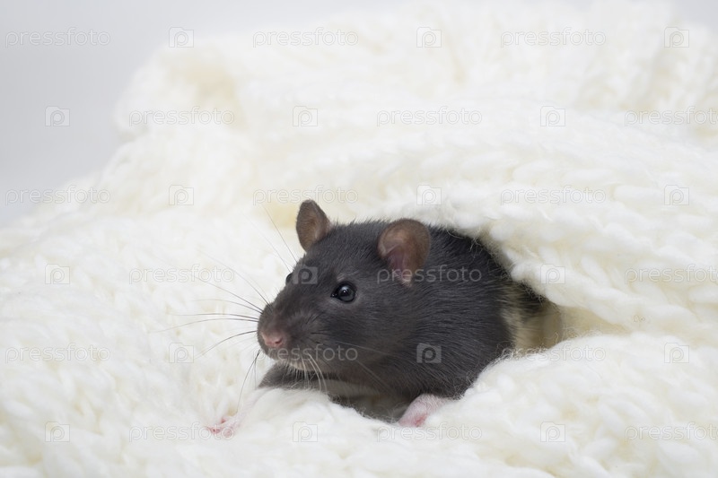 Рождественская крыса. Маленькая пушистая крыса в белом кремовом вязаном шарфе. Мышка новогодняя. Символ китайского лунного гороскопа