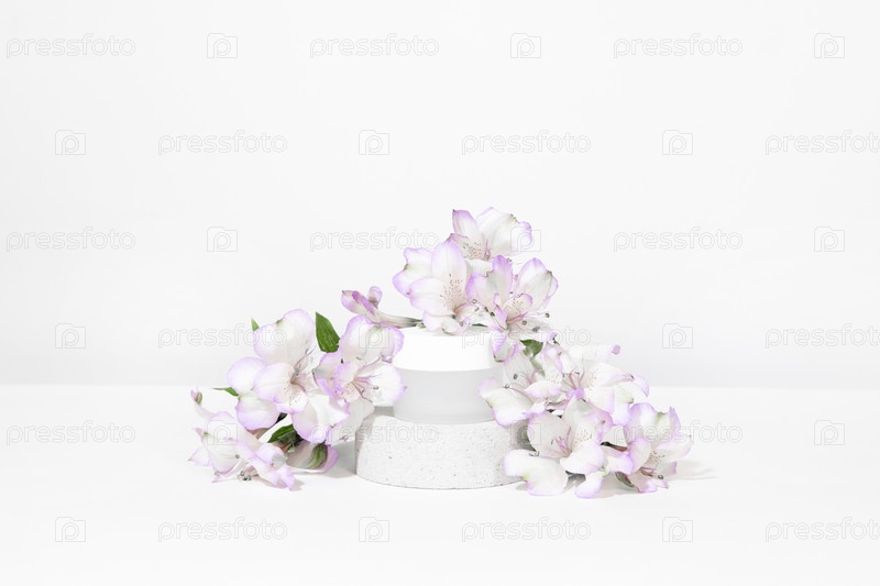 Макет белой банки крема на подиуме из натурального камня, на белом столе, с растениями, цветами, с жесткими тенями. Стильный внешний вид продукта, индивидуальность