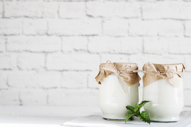Органический пробиотический молочный кефирный напиток или йогурт в стеклянной таре, на белом сером фоне. Здоровье кишечника. Молочный напиток холодного брожения с пробиотиками. Модная еда и напитки. Копировать пространство