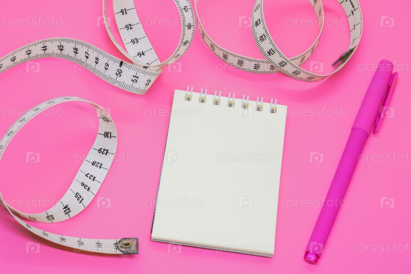 Пустой открытый блокнот с сантиметровой лентой на розовом фоне с пространством для текста или концепции деловой еды