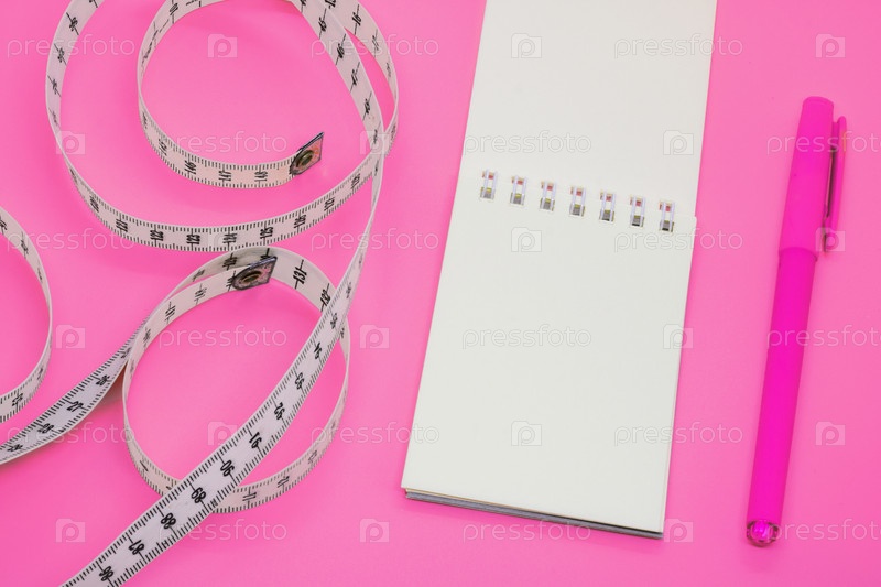 Пустой открытый блокнот с сантиметровой лентой на розовом фоне с пространством для текста или концепции деловой еды