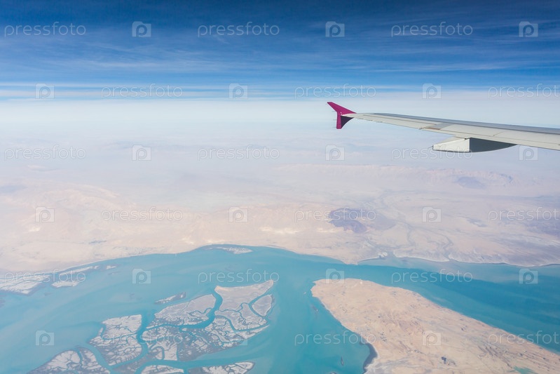 Вид с воздуха на пустыню из иллюминатора самолета. Концепция путешествия