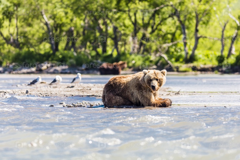 Бурый медведь или Ursus arctos beringianus ловит рыбу в Курильском озере.Камчатка, Россия