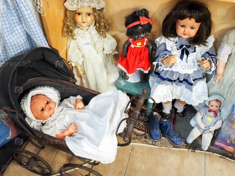 Старые разные куклы для продажи на блошином рынке в старом городе Яффо, Тель-Авив, Израиль