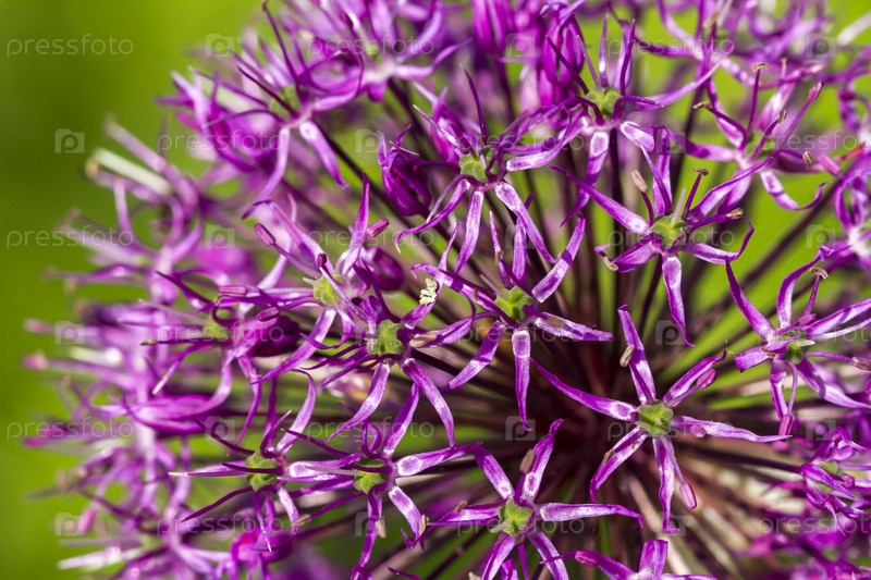 Цветущий декоративный лук на зеленом фоне. Макроизображение крупным планом