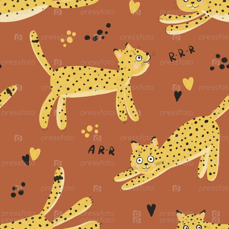 Бесшовный рисунок с леопардами, ягуаром на цветном фоне. Детская иллюстрация. Смешные обои с африканскими животными. Ручной рисунок ткани, обоев, бумаги для детской комнаты