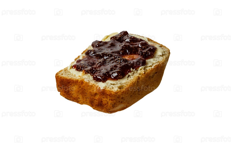 Ломтик белого хлеба с маслом и клубничным джемом на белом фоне