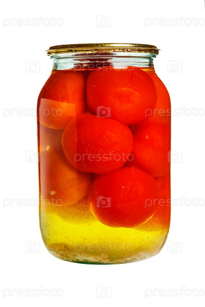 Маринованные помидоры в стеклянной банке, изолированные на белом фоне. Консервировнная еда