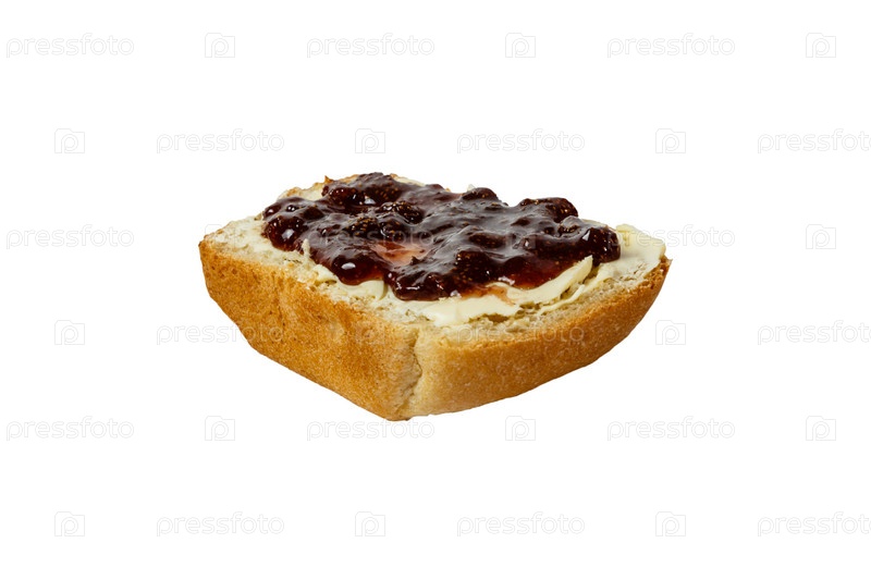 Ломтик белого хлеба с маслом и клубничным джемом на белом фоне