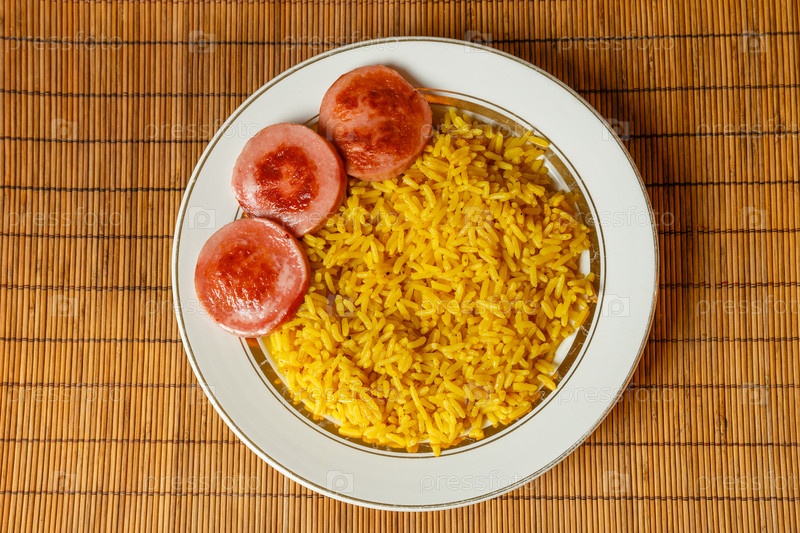 Желтый рис на тарелке с жареной колбасой
