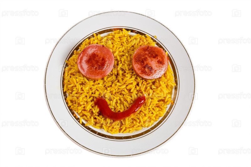 Желтый рис на тарелке с колбасой в виде глаз, веселая еда на белом фоне