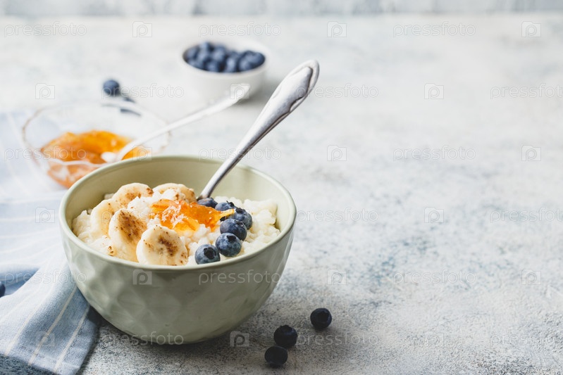 Завтрак с молочной рисовой кашей с бананами, черничным и апельсиновым джемом, сливочным рисовым пудингом или французским рисом с молоком в миске
