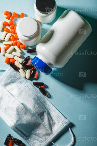Бутылка и таблетки на синем фоне, вид сверху. Концепция аптеки здравоохранения. Корона вирус
