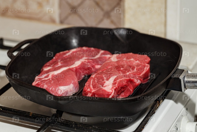 Два свежих сырых говяжьих стейка Prime Black Angus Chuck ролл-стейк, приготовленные на гриле в сковородке на газовой плите