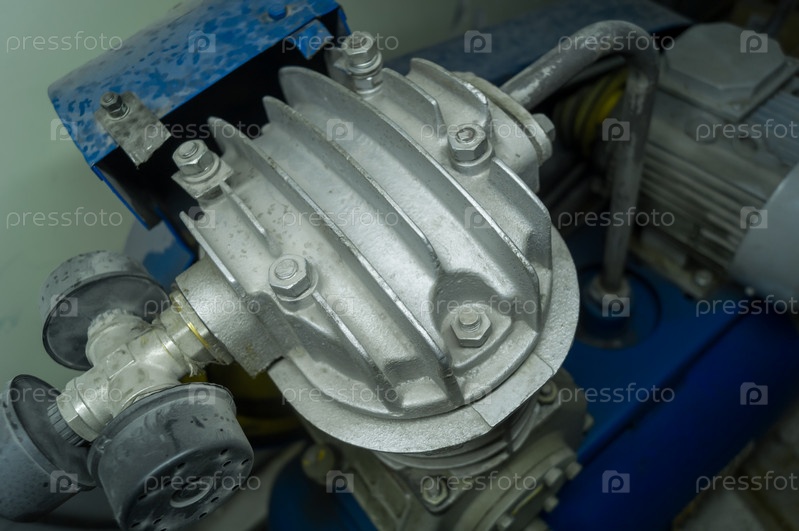 Головка цилиндра старого воздушного компрессора с электродвигателем. Промышленное оборудование для подачи сжатого воздуха в пневмосистему. Выборочный фокус