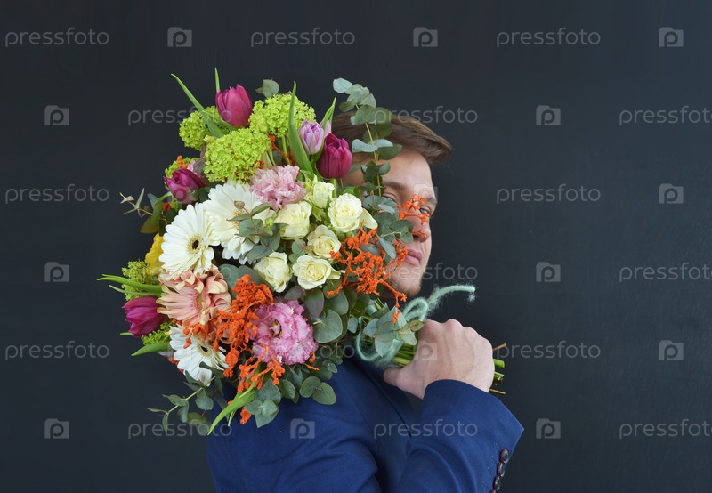 Мужчина держит в руках шикарный букет