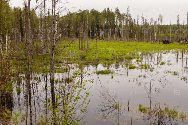 Пейзаж лесных деревьев болотной воды. Деревья в воде