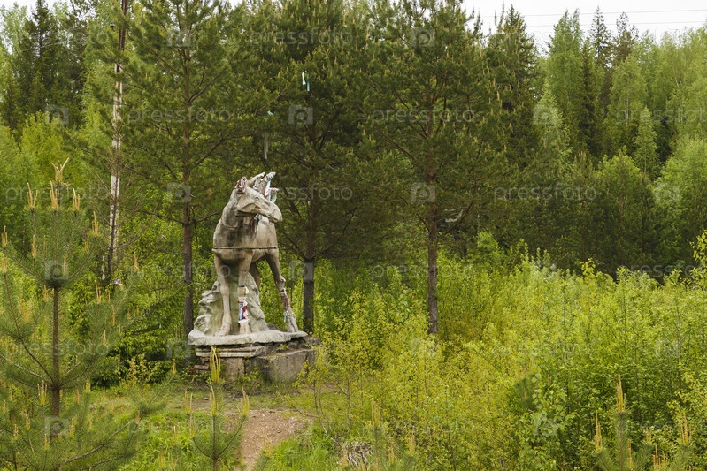 Лось, каменная скульптура в лесу Россия