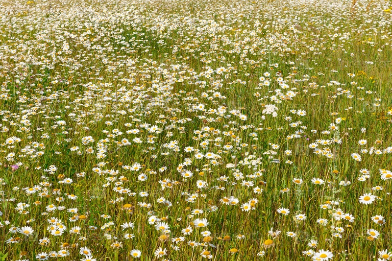 Поле цветов ромашки. На лугу цветут красивые цветы
