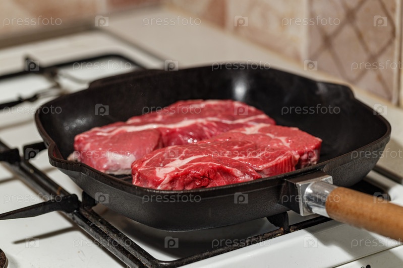 Два свежих сырых говяжьих стейка Prime Black Angus Chuck ролл-стейк, приготовленные на гриле в сковородке на газовой плите
