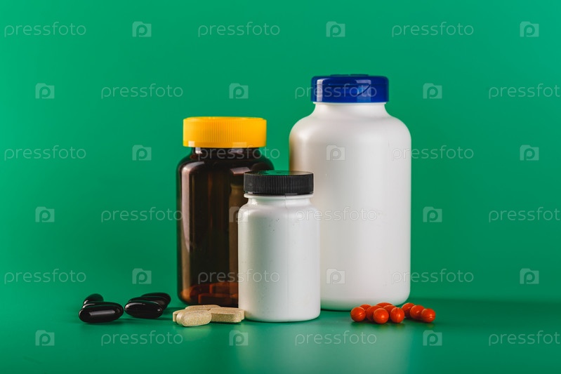 Бутылка и таблетки на зеленом фоне. Концепция аптеки здравоохранения. Корона вирус