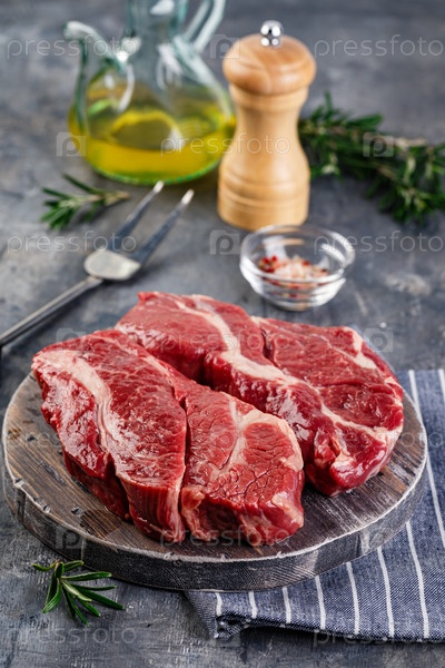 Два стейка из свежего сырого мяса Prime Black Angus Chuck, на деревянной разделочной доске на сером фоне