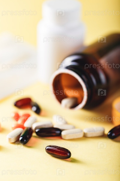 Бутылка и таблетки на желтом фоне. Концепция аптеки здравоохранения. Корона вирус