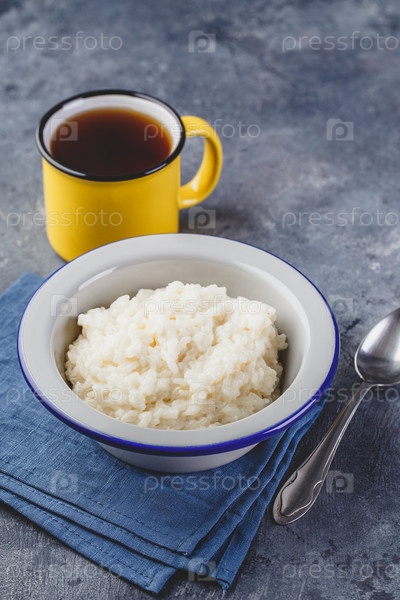 Молочная рисовая каша, сливочный рисовый пудинг или французский рис с молоком в металлической миске и эмалированная кружка с чаем