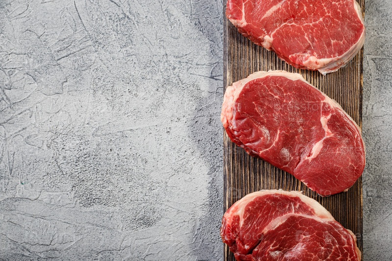 Три куска традиционного тонкого стейка, вырезанного из вырезки на деревянной разделочной доске. Стейк имеет хорошую мраморность, красивую ровную форму и нежную структуру мяса, подходит для гриля или сковороды. Вид сверху