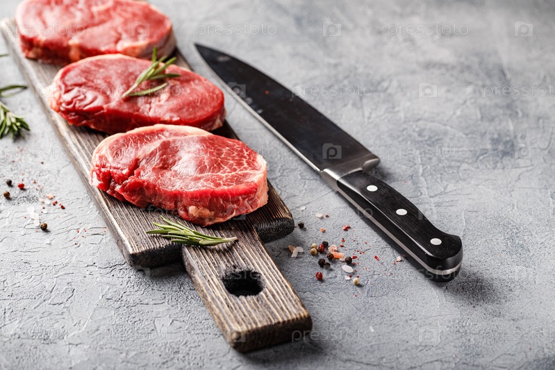 Три куска традиционного тонкого стейка, вырезанного из вырезки на деревянной разделочной доске с оливковым маслом, солью, розмарином и перцем. Стейки из сырого мяса Блэк Ангус Прайм подходят для приготовления на гриле или на сковороде