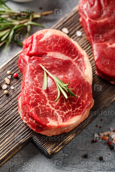 Три куска традиционного тонкого стейка, вырезанного из вырезки на деревянной разделочной доске с оливковым маслом, солью, розмарином и перцем. Стейки из сырого мяса Блэк Ангус Прайм для приготовления на гриле или на сковороде. Крупным планом