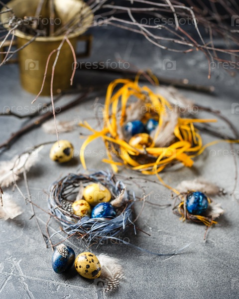 Цветные желтые и голубые пасхальные перепелиные яйца в небольших гнездах. Перепелиные яйца к католической и православной пасхе. Малая глубина резкости