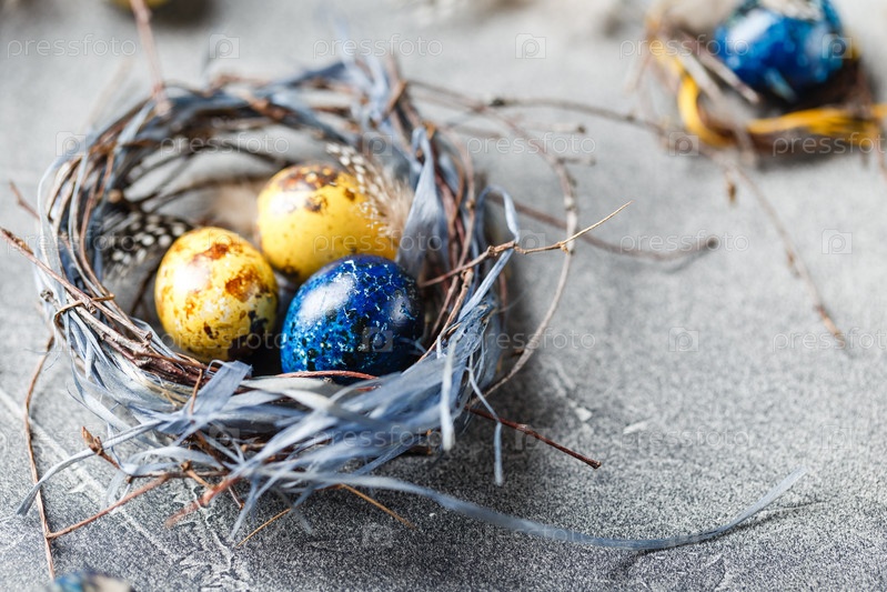 Цветные желтые и голубые пасхальные перепелиные яйца в небольших гнездах. Перепелиные яйца к католической и православной пасхе. Малая глубина резкости