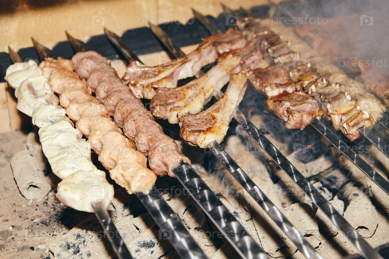 Шашлык на шпажках из разных видов мяса жарится на гриле