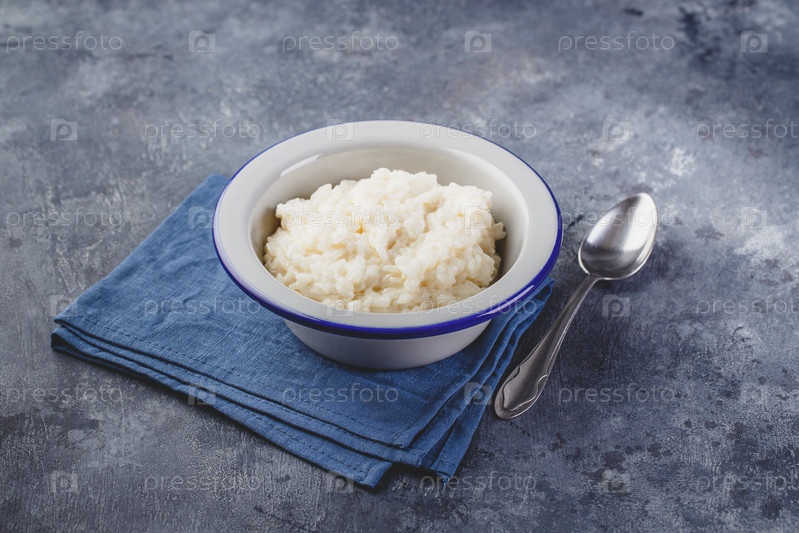 Молочная рисовая каша, сливочный рисовый пудинг или французский рис с молоком в металлической миске