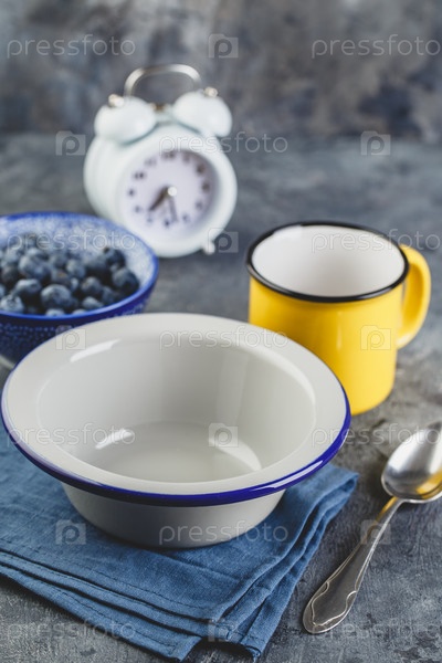 Сервировка завтрака с пустой металлической миской