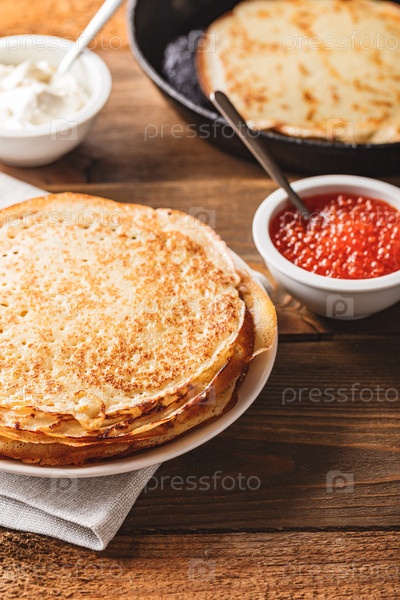 Стопка русских блинов с красной икрой, свежей сметаной