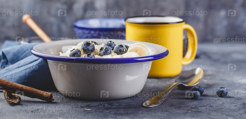 Молочная рисовая каша с черникой и бананом, сливочный рисовый пудинг или французский рис с молоком в металлической миске и эмалированная кружка с чаем