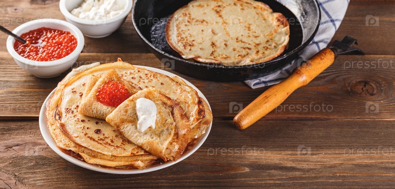 Стопка русских блинов с красной икрой, свежей сметаной
