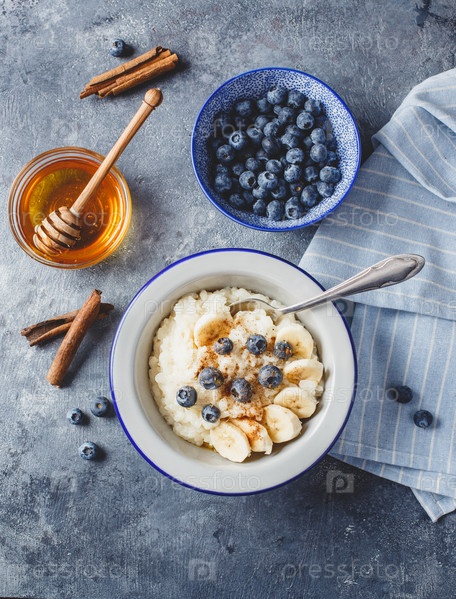 Молочная рисовая каша с черникой, бананом, медом и корицей, сливочный рисовый пудинг или французский рис с молоком в металлической миске. Вид сверху