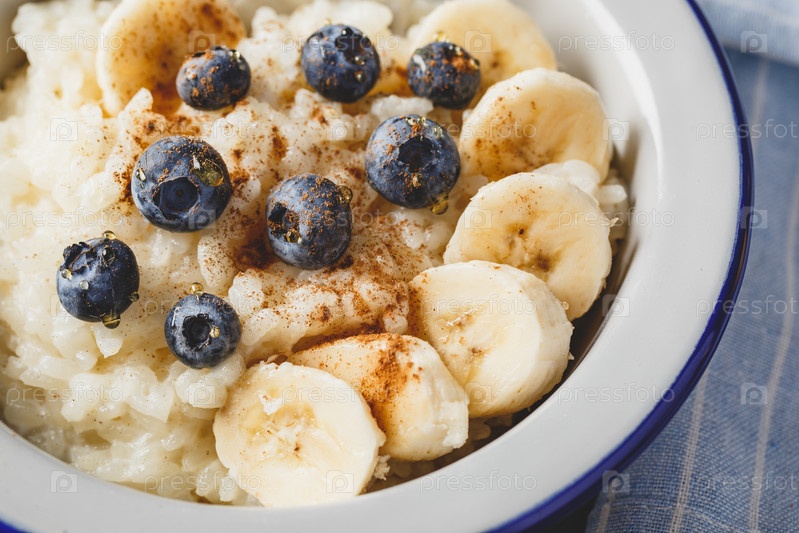Молочная рисовая каша с черникой, бананом, медом и корицей, сливочный рисовый пудинг или французский рис с молоком в металлической миске