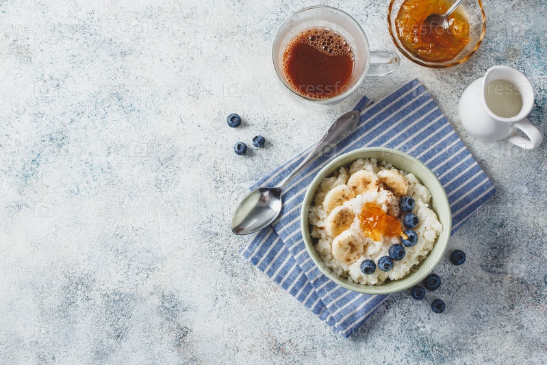 Завтрак с молочной рисовой кашей с бананами, черничным и апельсиновым джемом, сливочным рисовым пудингом или французским рисом с молоком в миске, стеклянной чашкой с какао и будильником. Вид сверху, место для текста