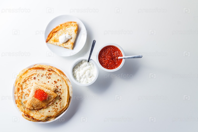Стопка русских блинов с красной икрой, свежей сметаной